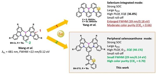 However, a drawback of directly embedding Se atoms into the MR-TADF framework is that it can lead to increased structural relaxation of the molecules, thereby extending full width at half maximum (FWHMs). To address this issue, Professor Yang Chuluo's team employed a peripheral heavy atom modification strategy. They connected heavy-atom-integrated selenoxanthone moiety to the periphery of the MR-TADF framework via a single bond, leading to the synthesis of a pure green-emitting material called BN-STO. This material combines the advantages of high color purity and a rapid reverse intersystem crossing process. The organic light-emitting diode device based on BN-STO exhibited state-of-the-art performance with a maximum external quantum efficiency (EQE) of 40.1% and maintains a close to 30% a brightness of 1000 cd m-2, with CIE color coordinates of (0.19, 0.70), which closely matches the pure green light standard (0.21, 0.71) set by the National Television System Committee (NTSC). This work was recently published in Angewandte Chemie International Edition